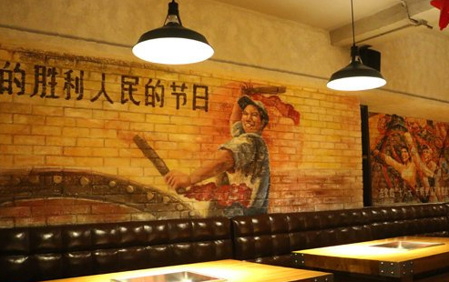 “同志你好,欢迎下乡!”当穿着绿军装、带着红袖章的服务员以一种穿越时空的亲切感引领客人走进大队长主题火锅,五角星、老照片、高板凳、红色题材墙绘、随处可见的毛主席语录、荡气回肠的向前进手势……独具匠心的红色文化装修让人仿佛又回到了那个热血激情的年代。